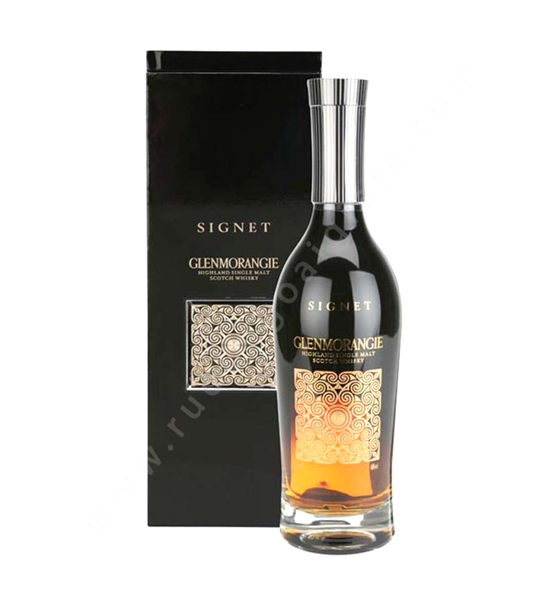 Glenmorangie – được chưng cất từ hơn 30 năm trước, khi mạch nha vẫn còn được phơi trên sàn – và rượu trưởng thành trong các thùng gỗ sồi tốt nhất trên thế giới, dòng sản phẩm này là dòng whisky phong phú nhất trong bộ sản phẩm nhà Glenmorangie. Một phản ứng tổng hợp của các yếu tố độc đáo hiếm có, che phủ trong vòng bí mật, Signet là thành quả của kinh nghiệm trong suốt cuộc đời . Một hỗn hợp pha trộn từ những dòng whisky lâu đời nhất Vị ngọt tan chảy & hương thơm bùng nổ của Signet, đến từ loại mạch nha rang ‘chocolate’ độc đáo cũng như những thùng gỗ sồi được thiết kế riêng dành cho nhà Glenmorangie từ gỗ sồi trắng của Mỹ. Một sự kết hợp của các yếu tố độc đáo và hiếm, và bị che khuất trong bí mật, Signet là kết quả của kinh nghiệm của một đời. Một sự pha trộn của rượu lâu đời nhất của chúng tôi - chưng cất hơn ba mươi năm trước, khi mạch nha vẫn còn xảy ra trên trang web - và tinh thần trưởng thành trong một số thùng tốt nhất thế giới, chắc chắn đây là whisky giàu nhất trong phạm vi của chúng tôi. Tất nhiên, trong khi những bí mật chính xác của sản xuất của nó chỉ được biết đến là người sáng tạo whisky của chúng tôi, chúng tôi có thể cho bạn biết rằng sự tan chảy ngọt ngào Signet và cay nổ, ít nhất một phần, do rang "sô cô la" mạch nha lúa mạch độc đáo của chúng tôi và của các nhà thiết kế thùng 'thực hiện riêng biệt cho Glenmorangie từ Mỹ sồi trắng. Nồng độ : 46% ABV , không lọc lạnh Hương : Hương cà phê Aruba mạnh mẽ kết hợp với bánh pudding mật mận, hương sherry phong phú và kẹo vỏ cam Vị : Sự tương phản của vị ngọt phong phú với sự bùng nổ của các hương vị nóng bỏng cùng mocha đắng. Kết thúc : Giống như một làn gió nhẹ mùa xuân mang hương bạc hà và hương chanh cam thơm nhẹ. Màu : Hổ phách sẫm
